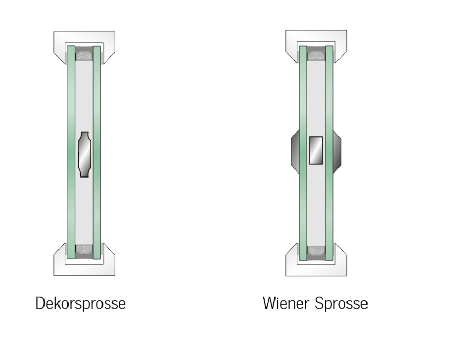 Durch den Einbau im Scheibenzwischenraum sind die Sprossenprofile außerdem dauerhaft vor der Witterung geschützt. Diese nur im Scheibenzwischenraum eingebauten Sprossen gibt es in einer Fülle von Formen, Farben und Dekoren, von breiteren Profilen in weiß, farbig oder mit Holzdekor bis hin zu filigranen Zierprofilen in Metalloptik.